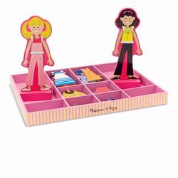 This magnetic dress-up play set makes kids the stylists! Abby and Emma Wooden Magnetic Dress-Up Dolls play set includes two doll figures and 56 pieces of magnetic clothing that fit onto either one. Mix and match hundreds of possible doll outfits. then rearrange the pieces to change them again and again! Each magnetic fashion doll comes with a wooden stand for display and pretend play, and the complete fashion play set fits in a sturdy wooden storage tray that keeps everything in its place. Extension Activities: More Ways to Play and Learn: Ask the child to dress Abby & Emma, and then tell you a story about where they are going and what they will be doing. Ask the child to count the number of shoes or other articles of clothing contained in the set. Trace the pieces on paper and let the child color them. Assist in cutting out the new outfits that can be temporarily affixed to the existing pieces. Place four or more pieces in front of the child. Let her study the pieces before asking her to close her eyes while you remove one piece. Ask her to identify which piece was removed. Identify a specific outfit that Abby or Emma should wear, and have the child find it. For example, "Put a green shirt and pink pants on Emma.