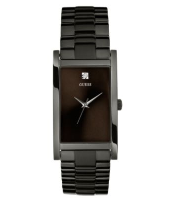 Watches. A stainless steel case and bracelet featuring ionic plates. The diamond accented black dial features silvertone hands. Analog function Quartz movement Water resistant to 100 ft. 10 year limited manufacturer's warranty Imported